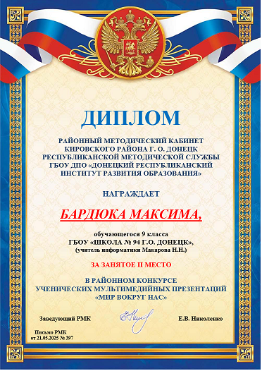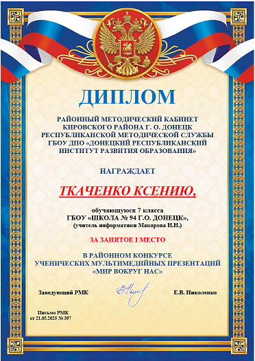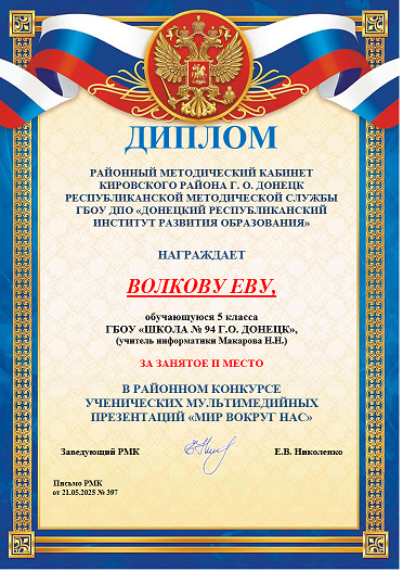 Завершился очередной Районный конкурс мультимедийных презентаций “Мир вокруг нас”. На него в этом учебном году были отправлены четыре работы от школы. Три из них получили призовые места на муниципальном этапе. Но, все четыре работы были победителями школьного этапа конкурса и выполнены на высоком профессиональном уровне.